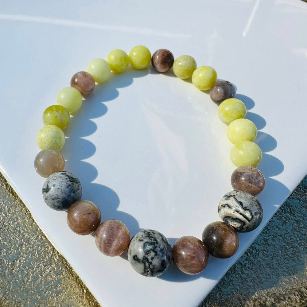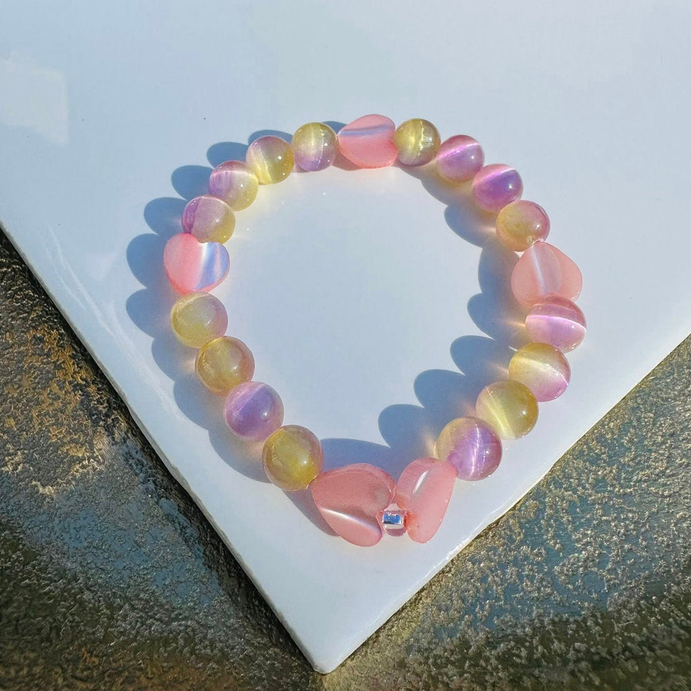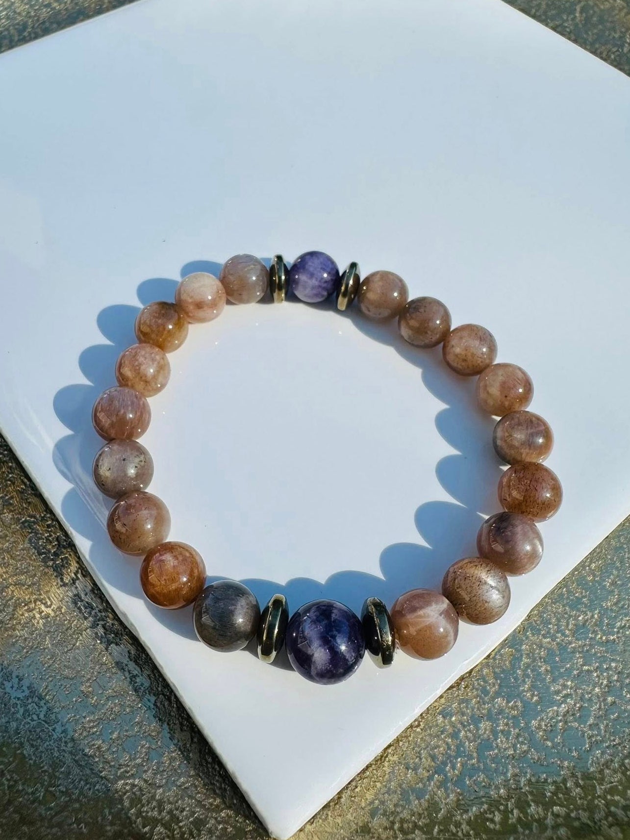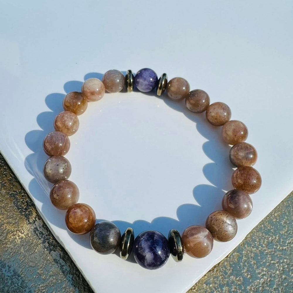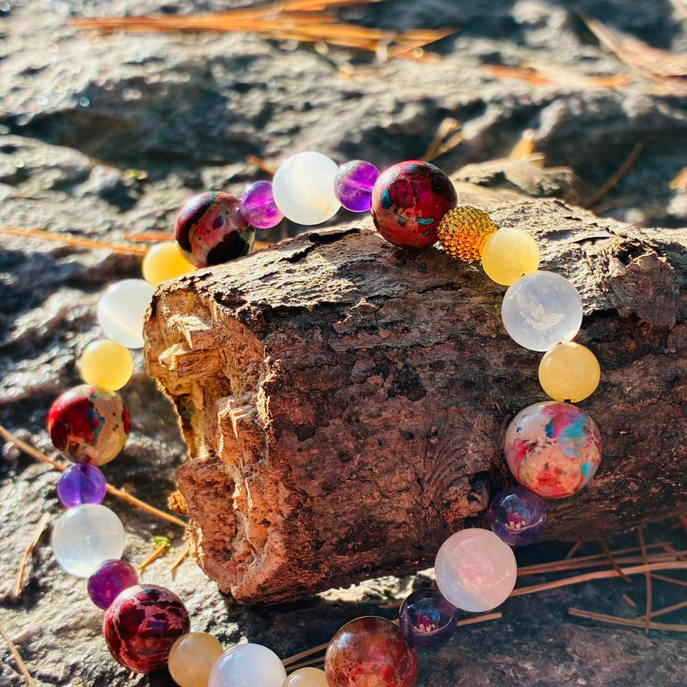 Bathed in golden hour light, this handmade gemstone bracelet embodies calm and clarity — a gentle glow carrying nature’s embrace, a moment of peace.