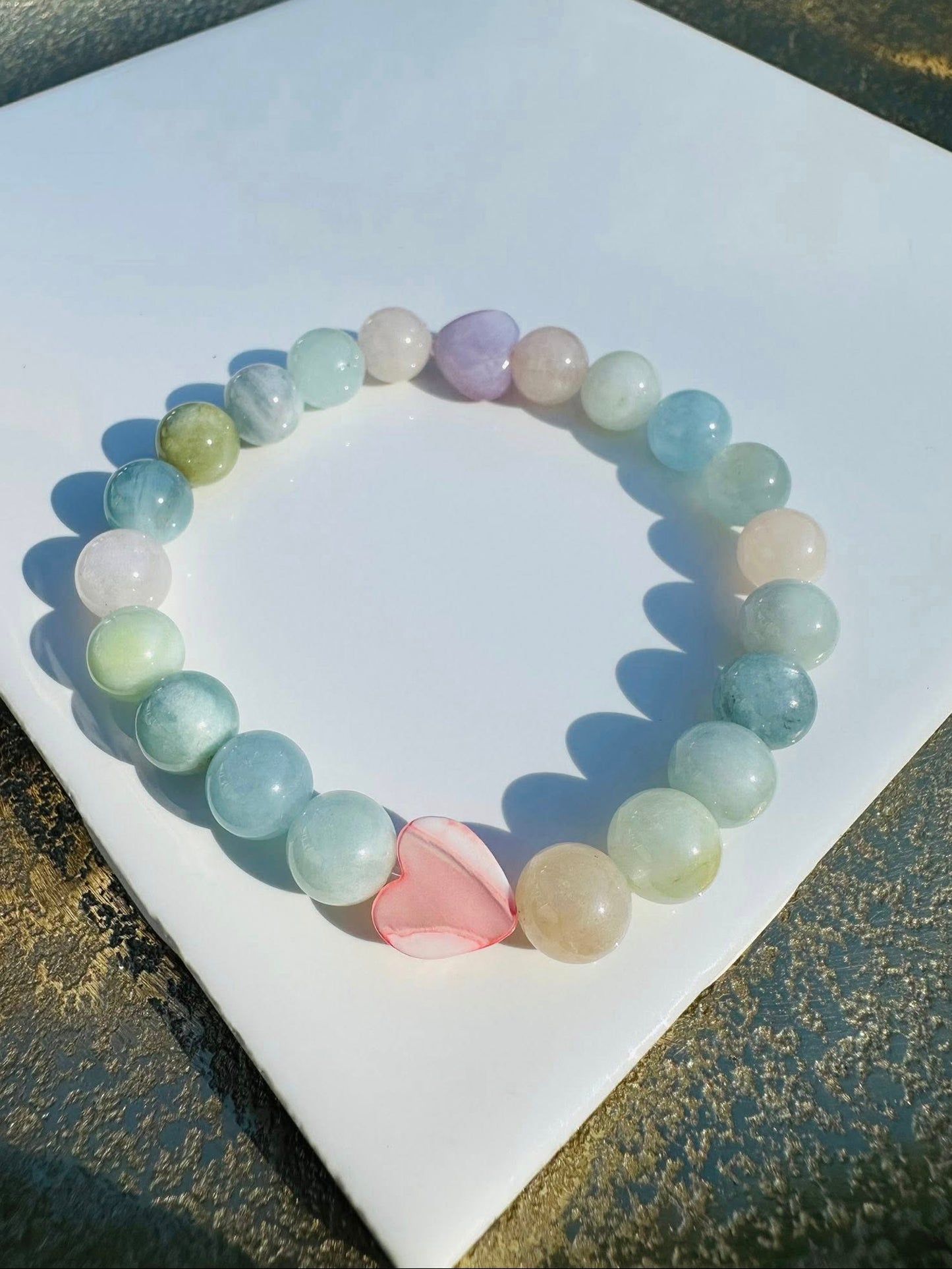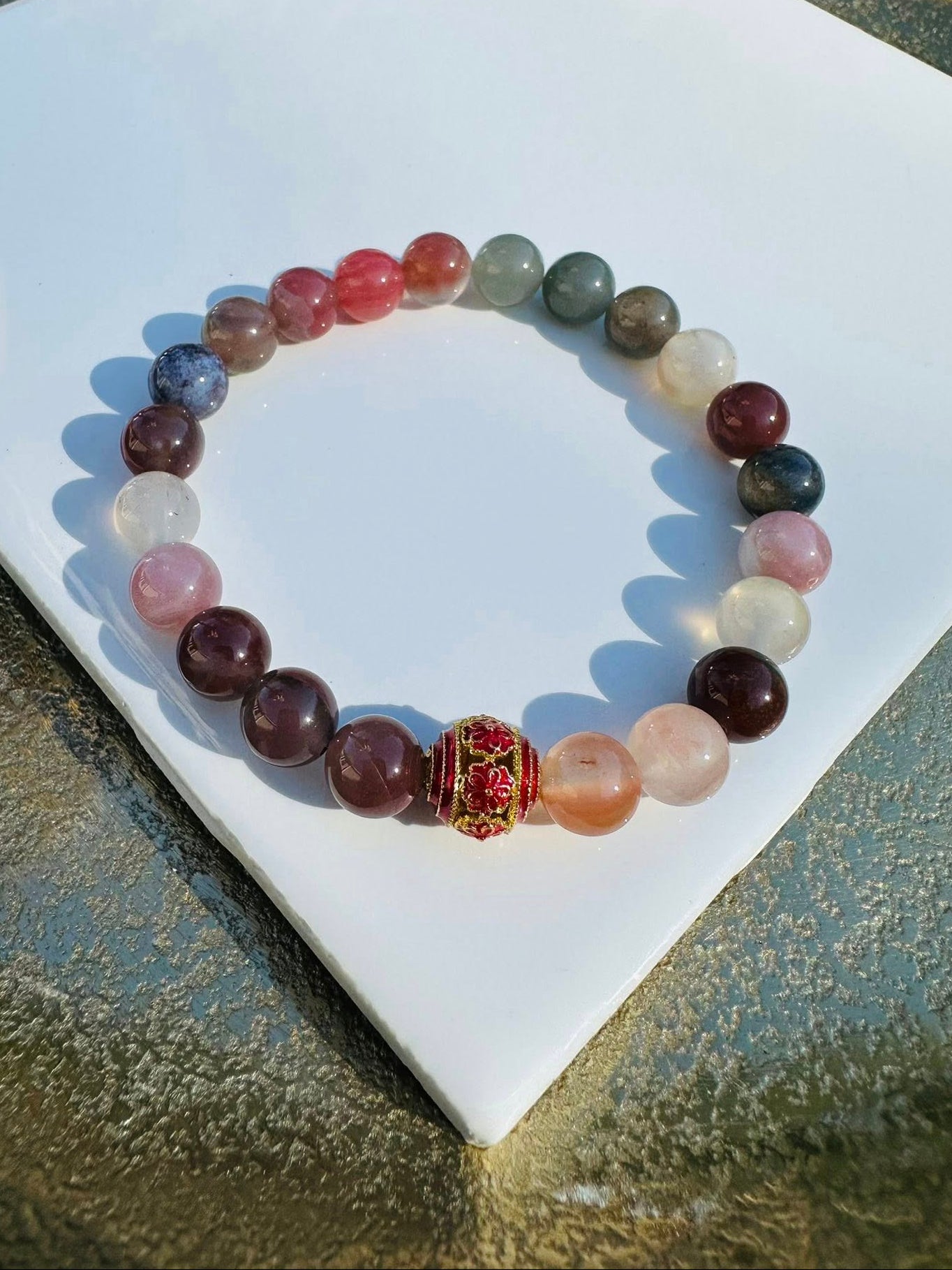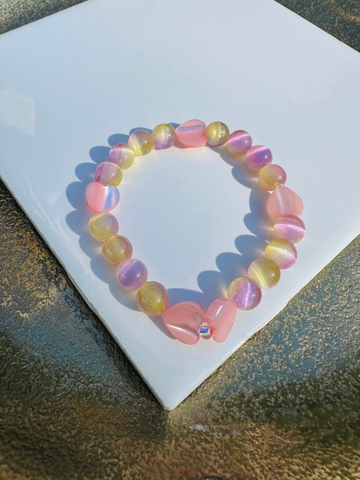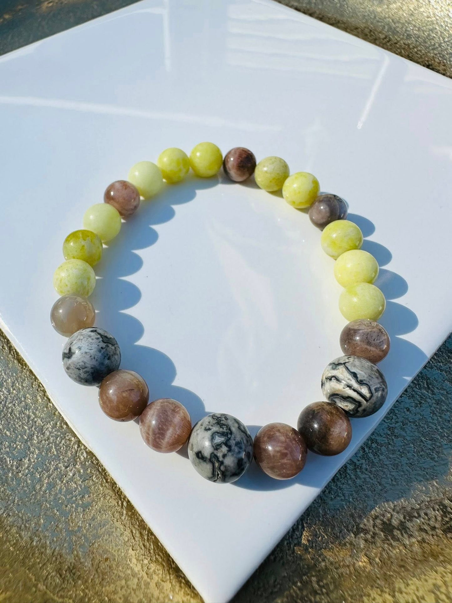 Bathed in golden hour light, this handmade gemstone bracelet embodies calm and clarity — a gentle glow carrying nature’s embrace, a moment of peace.
