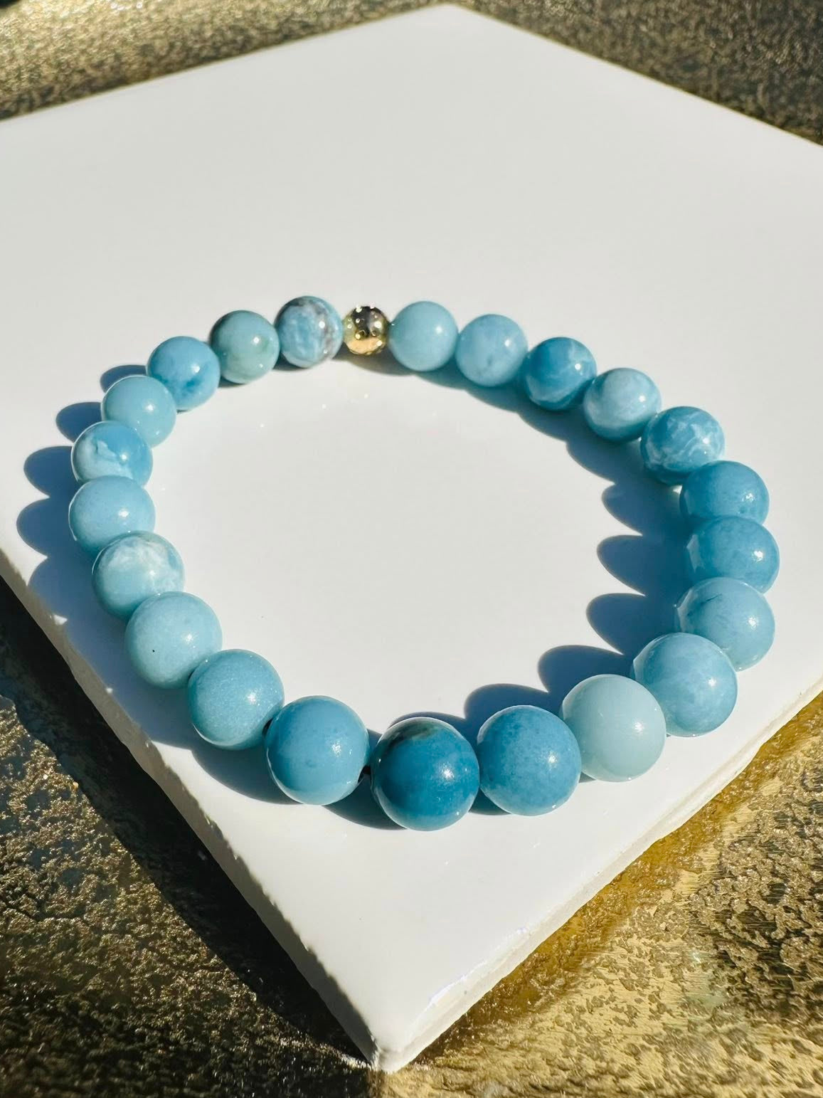 Regular price $60.00Larimar glows like Caribbean water—soft blue, tranquil, and full of light. A single gold spacer adds warmth and elegance, like sunlight dancing on waves.
