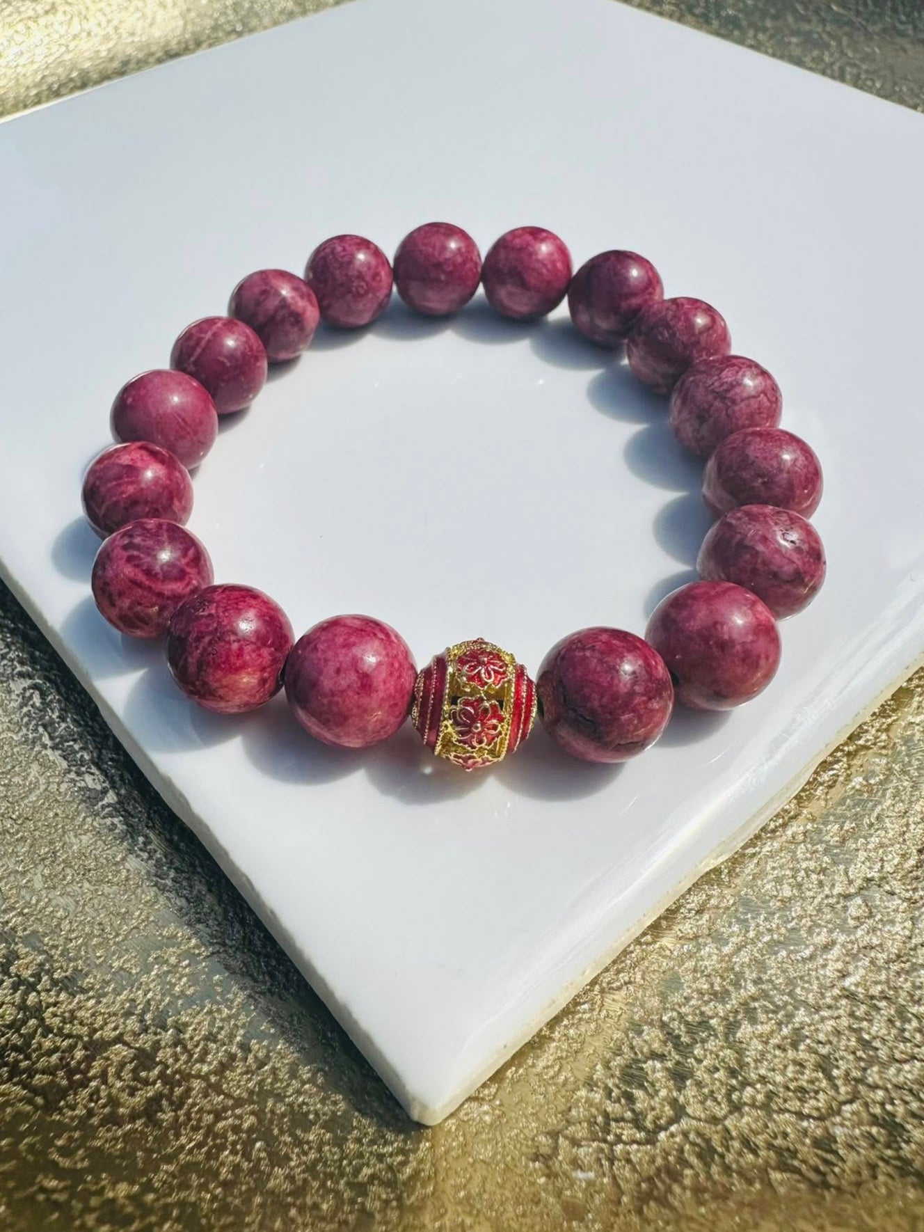 Add Courage- Vibrant Red Jade with Indigo Gabbro 10mm and ablue gold hand charm to the cart