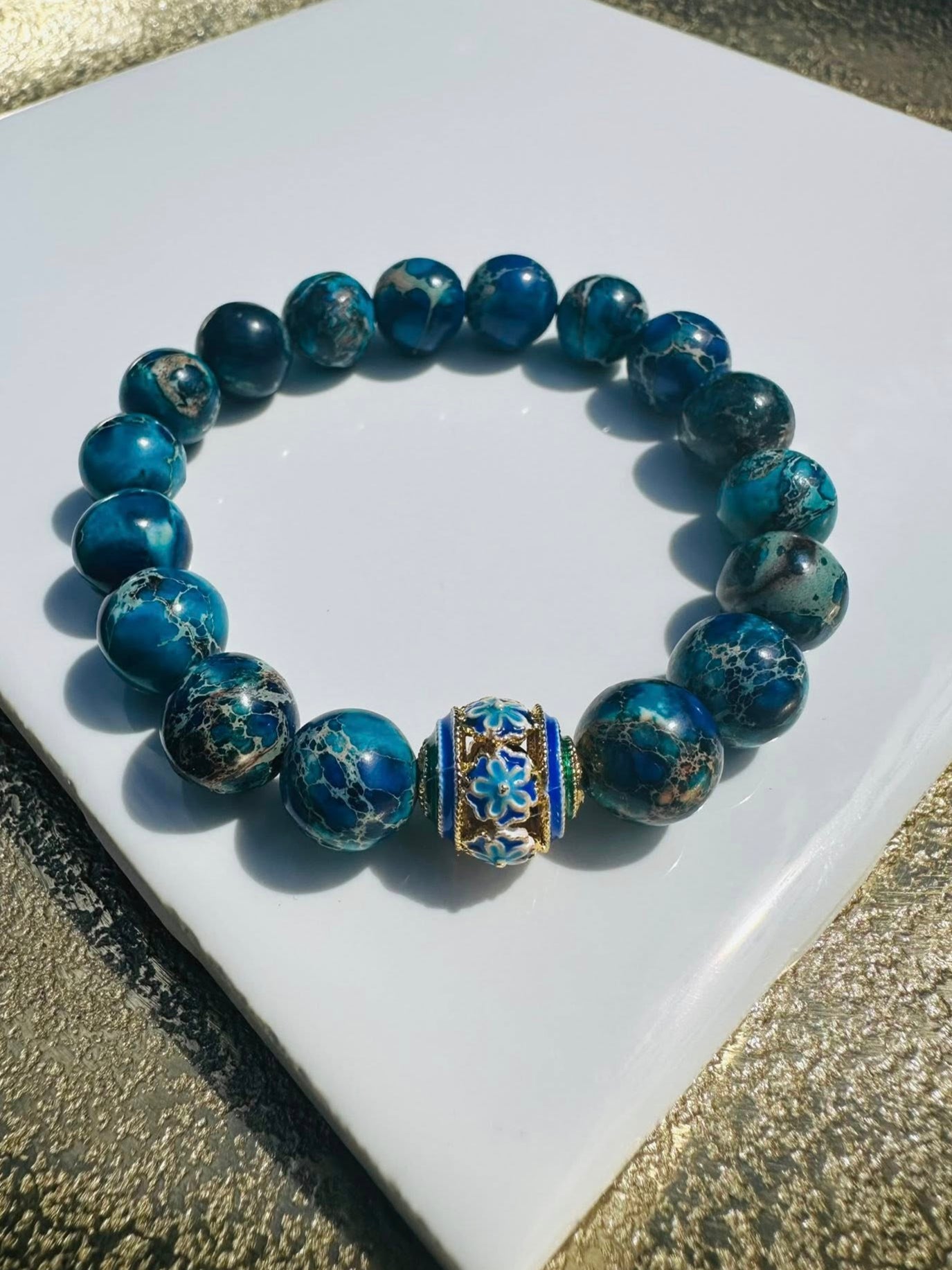 Add Denim Blue Sea Sediment Imperial Jasper with Gold Blue Flowers Ball 10mm to the cart