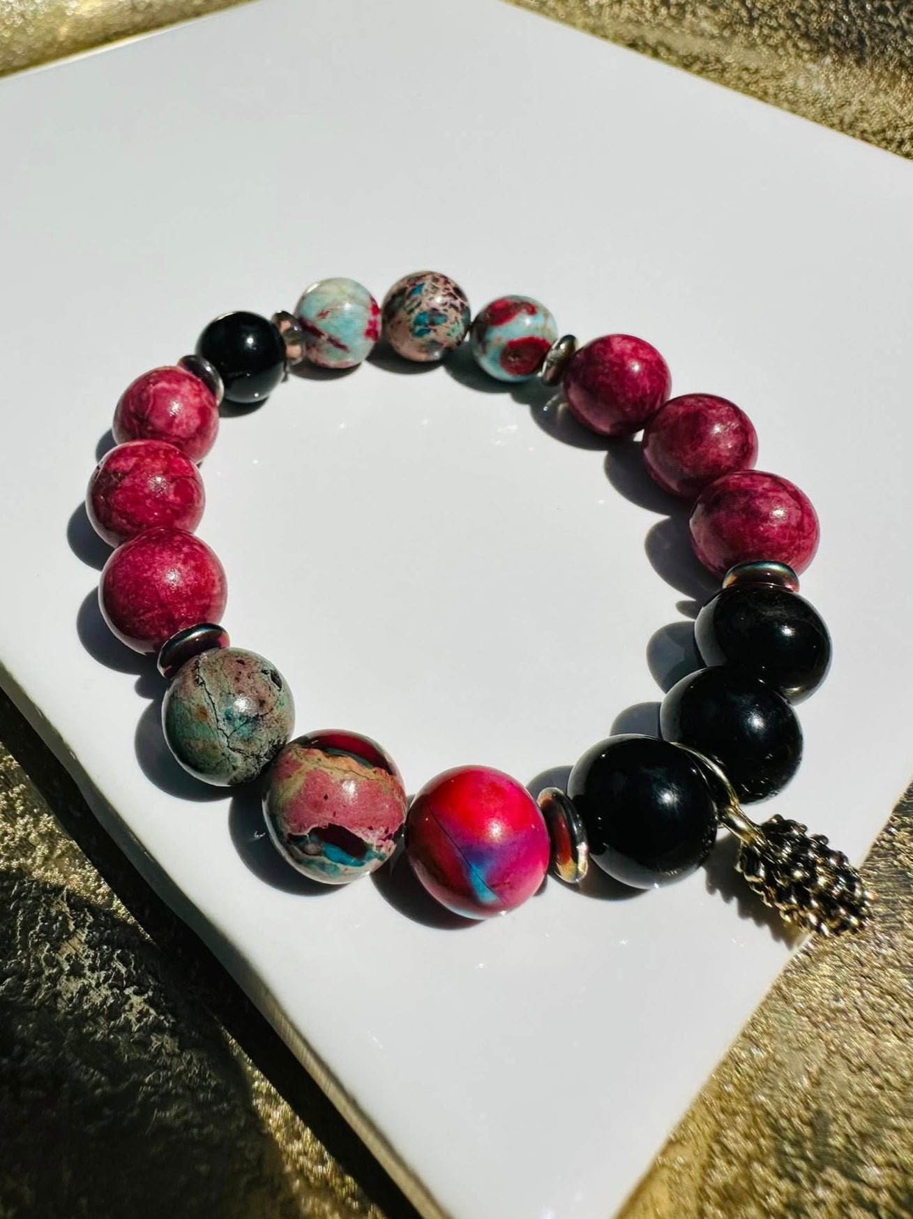 Add Brick Red Magnesite Turquoise 10mm, Red & Light Blue Sea Sediment Imperial Jasper with light brown spacers and a pine cone charm to the cart