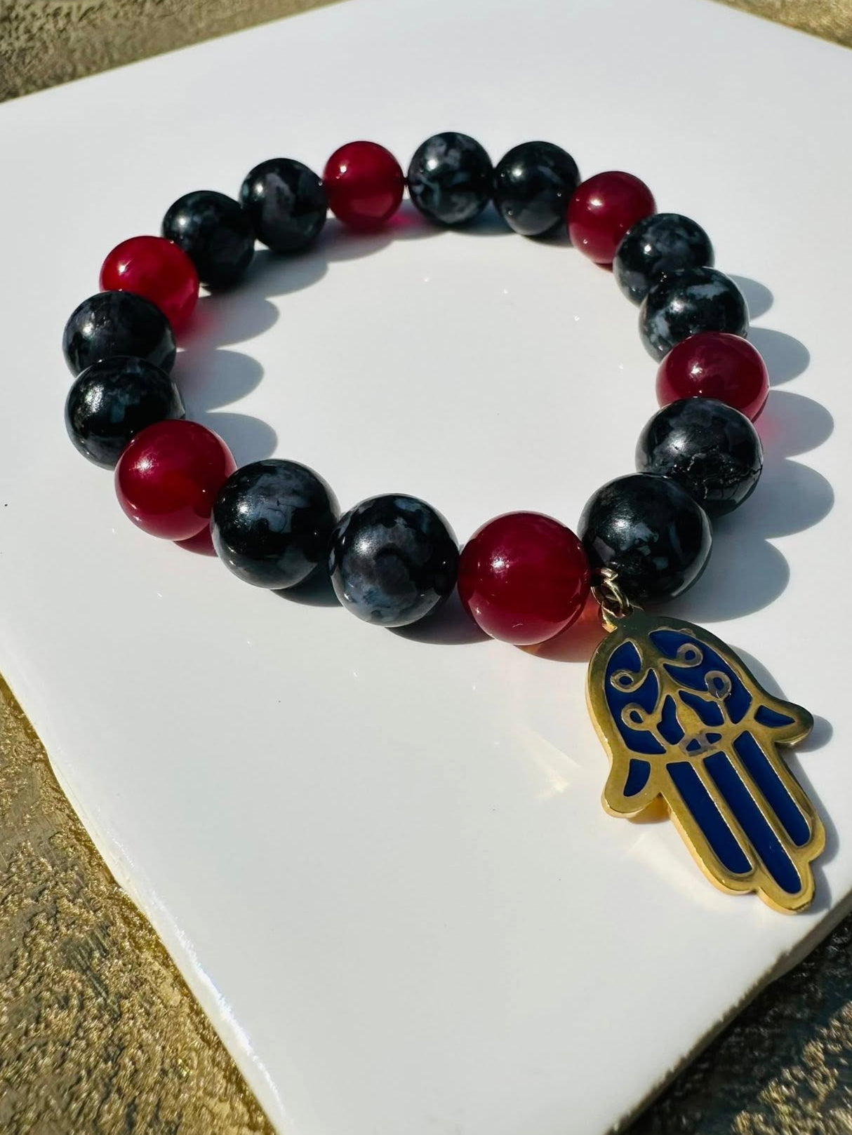 Add Courage- Vibrant Red Jade with Indigo Gabbro 10mm and ablue gold hand charm to the cart