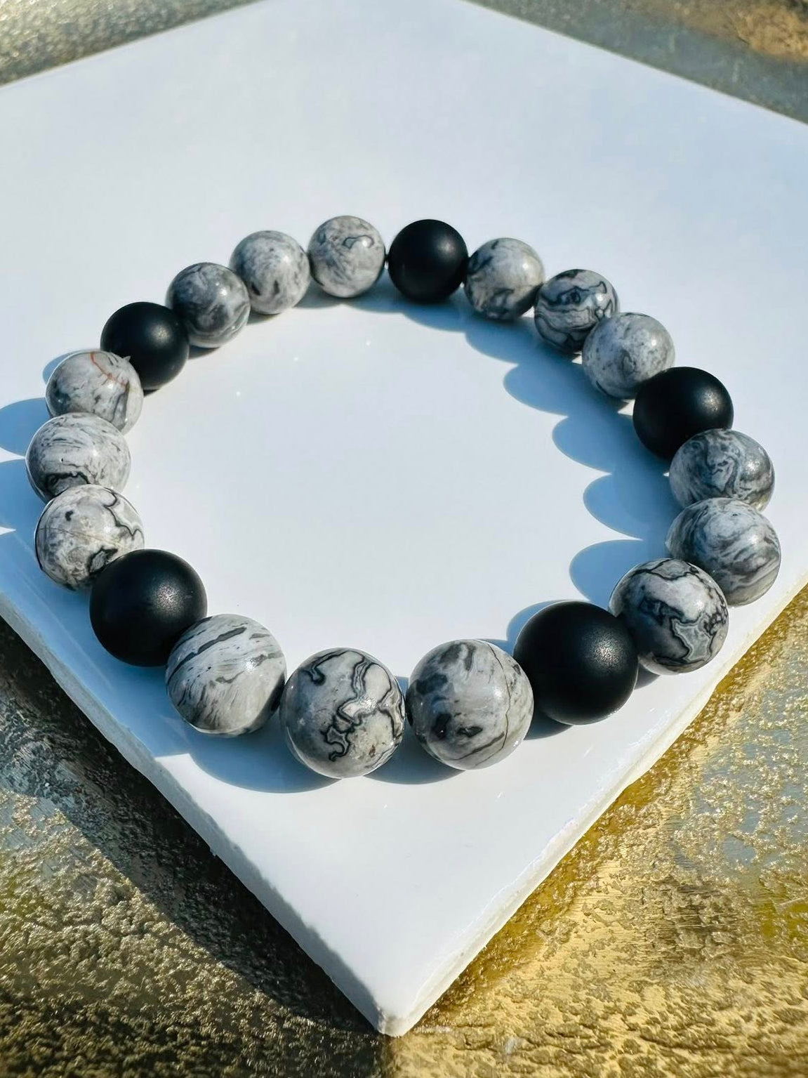 Add Stone Echo-Gray Map Stone Jasper beads 10mm, and Matte Black Onyx. to the cart