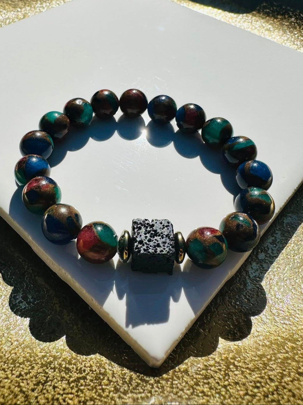 Add Stone Echo- Mosaic Impression Jasper beads 10mm. A cube-shaped Lava stone & two titanium pyrite spacers to the cart