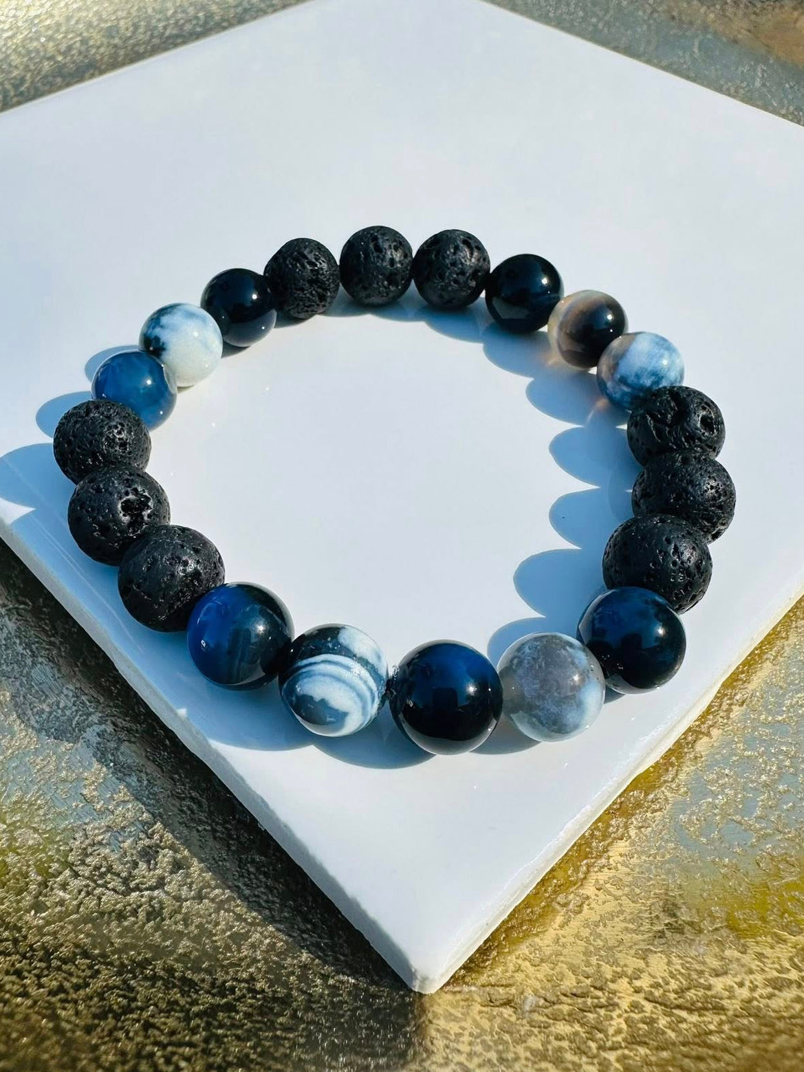 Add Royal Current- Mystic Lapis deep blue beads,Black Onyx (Matte), and Blue Tiger's Eye with a single Mystic blue flowergold space to the cart