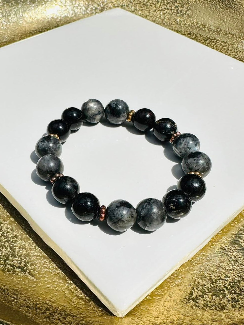 Add Natural Black Tourmaline & Natural Larvikite AKA Black Labradorite 10mm with bronze small flowers spacers to the cart